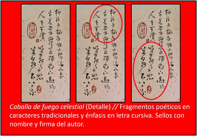 Para apoyar su apuesta por la cultura asiática en relación con el caballo, utiliza Alexis González los títulos de las obras; textos que aunque no escapan a la polisemia en su interpretación, el espacio expositivo les guía por el sendero de la cultura china. “Caballo de fuego celestial”, “Longevo caballo de jade” y “La primavera llega primero al pie del viejo caballo”, por ejemplo, parecen apostar por la nobleza imperial de la dinastía Tang en el siglo IX o el respeto a la longevidad.