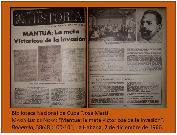 [9] María Luz de Nora: “Mantua: la meta victoriosa de la Invasión”, Biblioteca Nacional de Cuba “José Martí” (BNCJM). Bohemia, 58(48):100-101, La Habana, 2 de diciembre de 1966.