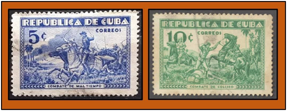 Las representaciones de las batallas de Mal Tiempo (15-12-1895, Cruces, Cienfuegos) y Coliseo (23-12-1895, Coliseo, Matanzas), consideradas entre las acciones de mayor significación militar, serán interpretadas filatélicamente a partir de las crónicas de sus oficiales, al margen del monumento de la autoría del escultor catalán Gerardo Huquet inaugurado en Cruces el 19 de mayo de 1910, en “conmemoración del XV aniversario de la caída en combate de nuestro Héroe Nacional José Martí”.[21] De la primera contienda describe Eugenio Sánchez Agramonte: "partieron como un rayo 250 jinetes con el machete en alto, las riendas semisueltas, sostenidas por la mano izquierda, que a la vez se agarraba a las crines siguiendo como un torbellino al invicto General Gómez, que clavado y tieso en su montura, más parecía un centauro que un ser humano";[22] de la segunda, apunta la historiografía: "El suceso que allí desató las más encendidas pasiones dentro del alto mando peninsular, prueba la gloria combativa del Ejército Libertador de Cuba bajo el mando de Máximo Gómez y Antonio Maceo y la posibilidad real de su pequeña pero heroica tropa de vencer en la lucha a la fuerza expedicionaria más poderosa desplegada por España en sus dominios coloniales”.[23]