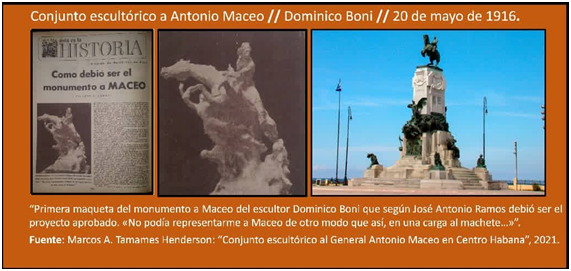 [7] “En el debate entre ética artística y exigencia del jurado, el conjunto escultórico a Maceo fue realizado bajo exigencias de estética gubernamentales que se tradujeron en «ese absurdo caballo griego, con ese general de parada encima»; desestimada fue la propuesta en la que Antonio Maceo, el «mambí» protagonizaba una de sus tantas cargas al machete”. Marcos Antonio Tamames Henderson: “Conjunto escultórico al General Antonio Maceo en Centro Habana”, Blog Museo Municipal de Centro Habana, Las Habana, 20 de mayo de 2021. https://museocentrohabana.blogspot.com/2021/05/conjunto-escultorico-al-general-antonio.html.