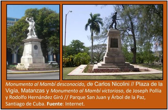 Al margen de una monografía en la que se aborde la representación escultórica del Mambí en Cuba se exponen aquí tres ejemplos. Las dos primeras de ellas dan muestra de la existencia de una comunidad interesada en perpetuar la imagen del Ejército Invasor con centro en los veteranos de la Guerra de Independencia en toda la Isla. En Matanzas, a propuesta de Domingo Lecuona y Madan, coronel del Ejército Libertador, se erige el “Monumento al Mambí Desconocido”, obra del italiano Carlos Nicolini que Carlos García Vélez y Augusto Casamayor Guerrero, describen en 1913 con las siguientes frases: “Capitán Libertador en traje de campaña mambí, con el machete en la diestra, defendiendo la bandera que descansa sobre el hombro izquierdo […]. Su indumentaria consiste en guerrera y pantalón, sombrero de guano, botas de montar, carreare con las insignias de Capitán, revólver y machete”.[24]