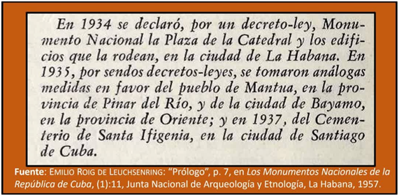 Sin embargo, entre la Ley del 24 de julio de 1928 y el Decreto no. 3057, se otorgan en Cuba, mediante decretos-leyes cinco declaratorias de Monumentos Nacionales, generalmente olvidadas a instancia nacional, pero perpetuadas desde las historias locales en que se encuentran. Durante la presidencia provisional de Carlos Mendieta Montefur (del 18 de enero de 1934 al 11 de diciembre de 1935), la “Plaza de la Catedral y los edificios que la rodean en La Habana”, mediante el Decreto Ley no. 613 del 23 de octubre de 1934 y “el pueblo de Mantua”, por el no. 207, del 1ro de septiembre de 1935. En la de José Agripino Barnet y Vinageras (del 11 de diciembre de 1935 al 20 de mayo de 1936), “la Ciudad de Bayamo”, por el no, 483 del 30 de diciembre de 1935 y; por Federico Laredo Brú (del 24 de diciembre de 1936 al 10 de octubre de 1940), “el Cementerio de Santa Ifigenia”, en Santiago de Cuba, mediante el no. 2933, del 7 de septiembre de 1937; y “la Plaza de Armas”, el 9 de agosto de 1937.