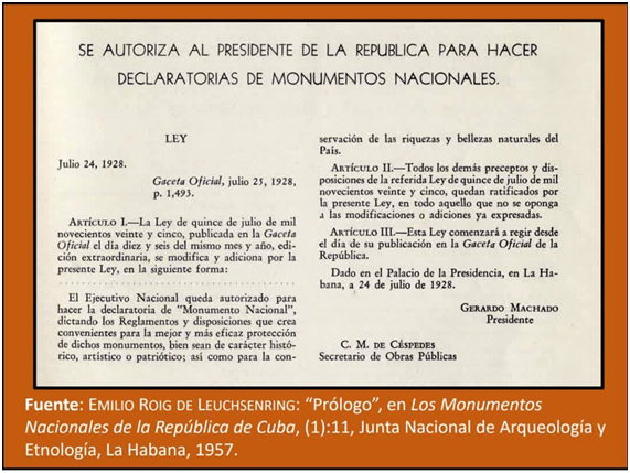 Los primeros pasos de declaratoria de Monumentos Nacionales en Cuba se manifiestan con la Ley del 24 de julio de 1928, en la que reza: “El Ejecutivo Nacional queda autorizado para hacer la declaratoria de Monumento Nacional, dictando los reglamentos y disposiciones que crea convenientes para la mejor y más eficaz protección de dichos documentos, bien sean de carácter histórico, artístico o patriótico; así como para la conservación de las riquezas y bellezas naturales del país”. El pronunciamiento de Rafael Rodríguez Altunaga por la declaración de Trinidad en El Comercio, en 1929, da muestra de su divulgación. Mas no es hasta ocho años después, mediante el decreto presidencial no. 3057, del 9 de agosto de 1937, firmado por Laredo Brú, que se crea la Comisión Nacional de Arqueología, “Primer organismo de carácter nacional creado para velar por la conservación del tesoro cultural de la República”, al tener a su cargo el registro de muebles e inmuebles de valor arqueológico o histórico de interés arqueológico o histórico y utilidad pública y los Monumentos Nacionales.[31]