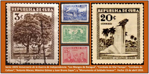 En los catálogos filatélicos la serie se registra del siguiente modo: “1933. XXXV Aniversario de la Guerra de Independencia”, lo que indica que se ha tomado como referencia el año 1898, cese del dominio colonial español y, en correspondencia a ello han de ser entendidos los pasajes iconográficamente representados en los cinco sellos que la integran. Obsérvese que el escenario de la Protesta de Baraguá y punto de partida de la Invasión de Oriente a Occidente, se representa con los árboles que dan nombre al lugar, a diferencia del término de la misma, Mantua, que pasa a ser simbolizado con el monumento recién construido. ¿No contaba Mangos de Baraguá con una construcción conmemorativa? ¿Resultaba suficiente nombrar su arbolada y el lugar para identificar el sitio histórico? ¿Y las Batallas de Mal tiempo y Coliseo?