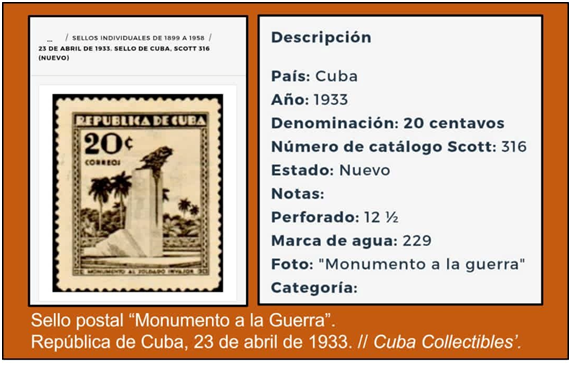Una herramienta en las técnicas de la información cuyos resultados pueden sorprendernos en el buscador de Google. Para este trabajo revela, en relación con "Monumento al Soldado Invasor", una representación inscrita el 23 de abril de 1933, cinco meses antes de ser inaugurada en la localidad la escultórica pieza de Juan José Sicre, el 19 de septiembre. Se trata del anuncio de un sello postal por Cuba Collectibles (Coleccionables de Cuba), una tienda online especializada en antigüedades cubanas, cuyo valor filatélico certifica el catálogo Scott con el no. 316. El exponente filatélico merece particular atención aquí por implicar cuatro de los cinco elementos a tener en cuenta para entender la construcción y deconstrucción de sentidos en el patrimonio: 1) su construcción social y su condición cultural, 2) su condición de referencia vital y cotidiana para la identidad de nuestros pueblos y comunidades, 3) de testimonio de la cultura de un pueblo, de su memoria, de los silencios y 4) su relación con el poder político, de gobierno y de los medios de comunicación masiva, para su reconocimiento, valorización y defensa a partir de políticas públicas.[12]
