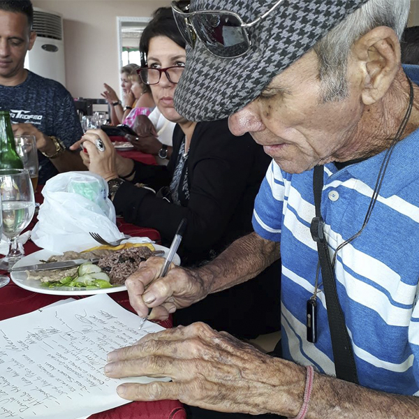 ESTE MISMO DÍA Y A INICIATIVA DEL COLEGA ARTURO KEMCHS SE REACTIVO LA UNIÓN DE CARICATURISTAS IBEROAMERICANOS (UNIHG). MOMENTOS EN QUE ROLAND DEJABA SU FIRMA. (FOTO: ADÁN IGLESIAS)
