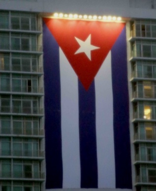 Bandera Cubana desplegada en el Hotel Habana Libre